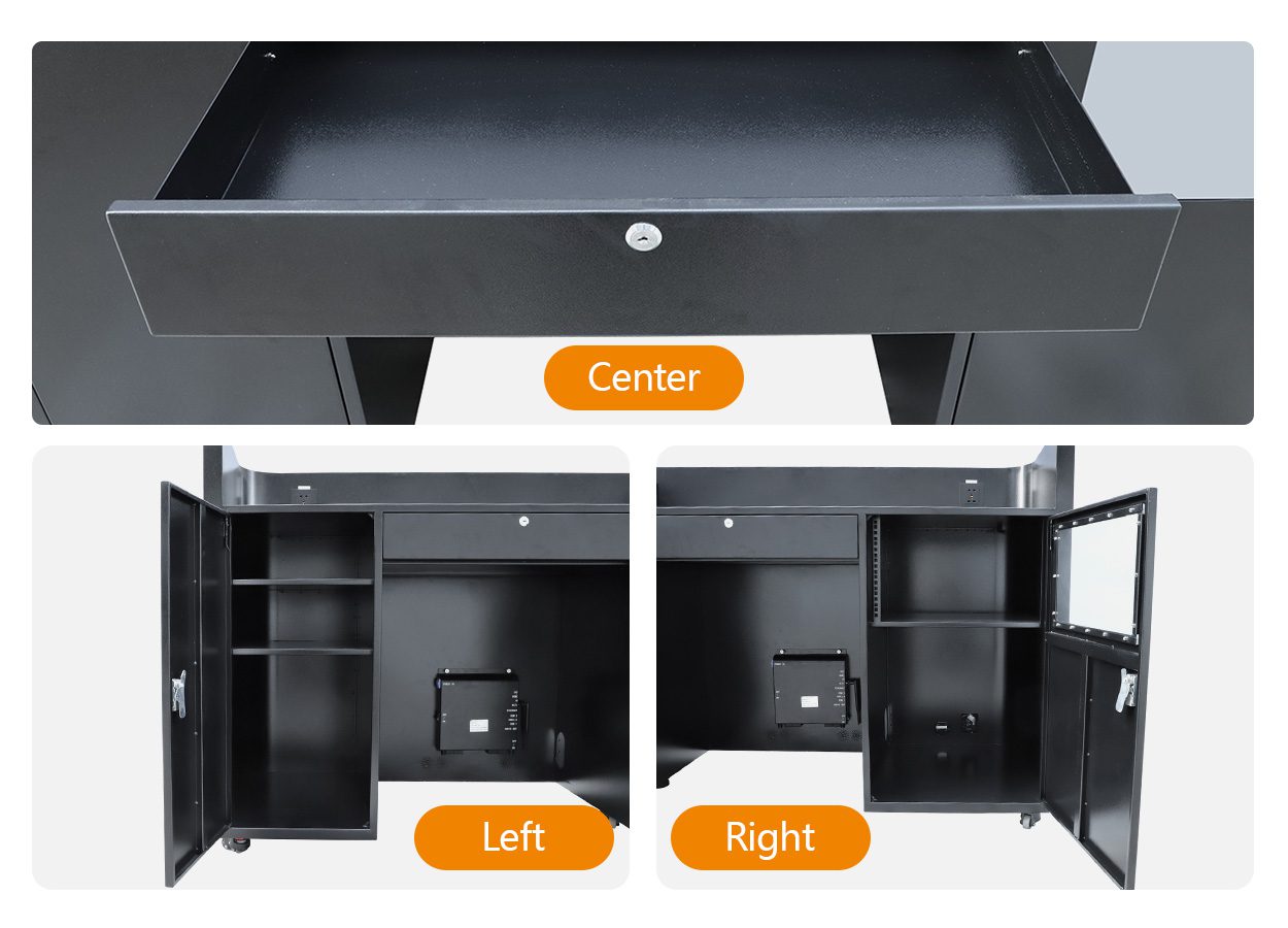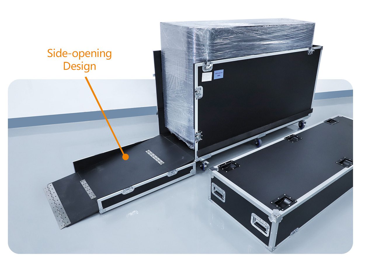 The side of the case opens to form a stable slope, designed for ease of operation. One person can easily slide the display out of the case and move it to the front desk or desired position. This clever design greatly reduces the complexity and manpower typically required for installation, saving on labor costs and installation time, ensuring fast deployment and efficient use.