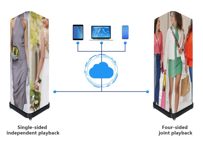 You don’t need to worry about the viewing angle. EA3DiP1 LED poster display has four-sided display. No matter which direction the audience watches from, they can get a consistent high-definition visual experience. And there are two display modes to choose from: four-sided synchronous and four-sided asynchronous.